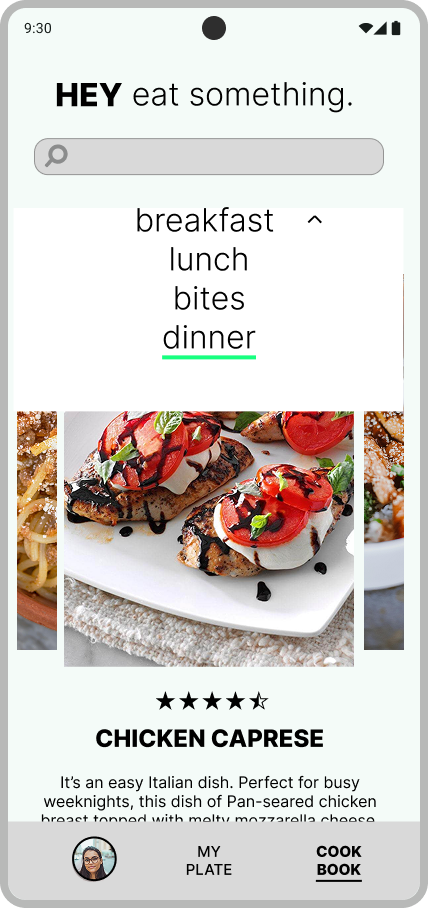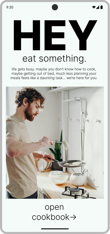 HEY eat something. is a mobile app designed for people who don’t know how to cook, don’t have the time, or feel too overwhelmed by life to think about what’s for dinner. To make cooking approachable with ultra-simple, step-by-step recipes that use minimal ingredients, require little prep, and deliver satisfying results.